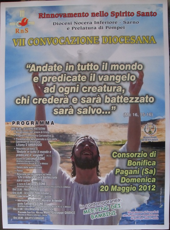Siamo tutti invitati a partecipare alla VII Convocazione Diocesana dei gruppi del Rinnovamento nello Spirito Santo che si svolgerà domenica 20 maggio 2012 presso il Consorzio di Bonifica di Nocera-Pagani (loc. S. Chiara), già sede ospitante della XXXIV Convocazione Regionale dei Gruppi e delle Comunità della Campania del 9 ottobre 2011.
